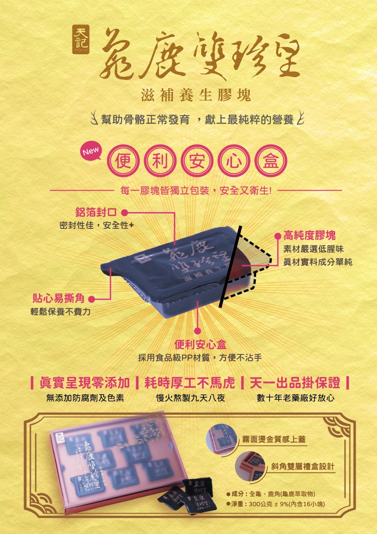 龜鹿雙珍皇 • 滋補養生膠塊 幫助骨骼正常發育,獻上最純粹的營養 素材嚴選低腥味,真材實料成分單純,絕無添加防腐劑及色素 ! 每一膠塊皆使用食品級PP材質的硬盒包裝,方便不沾手,安全又衛生 ! 官網產品介紹 購買這邊請